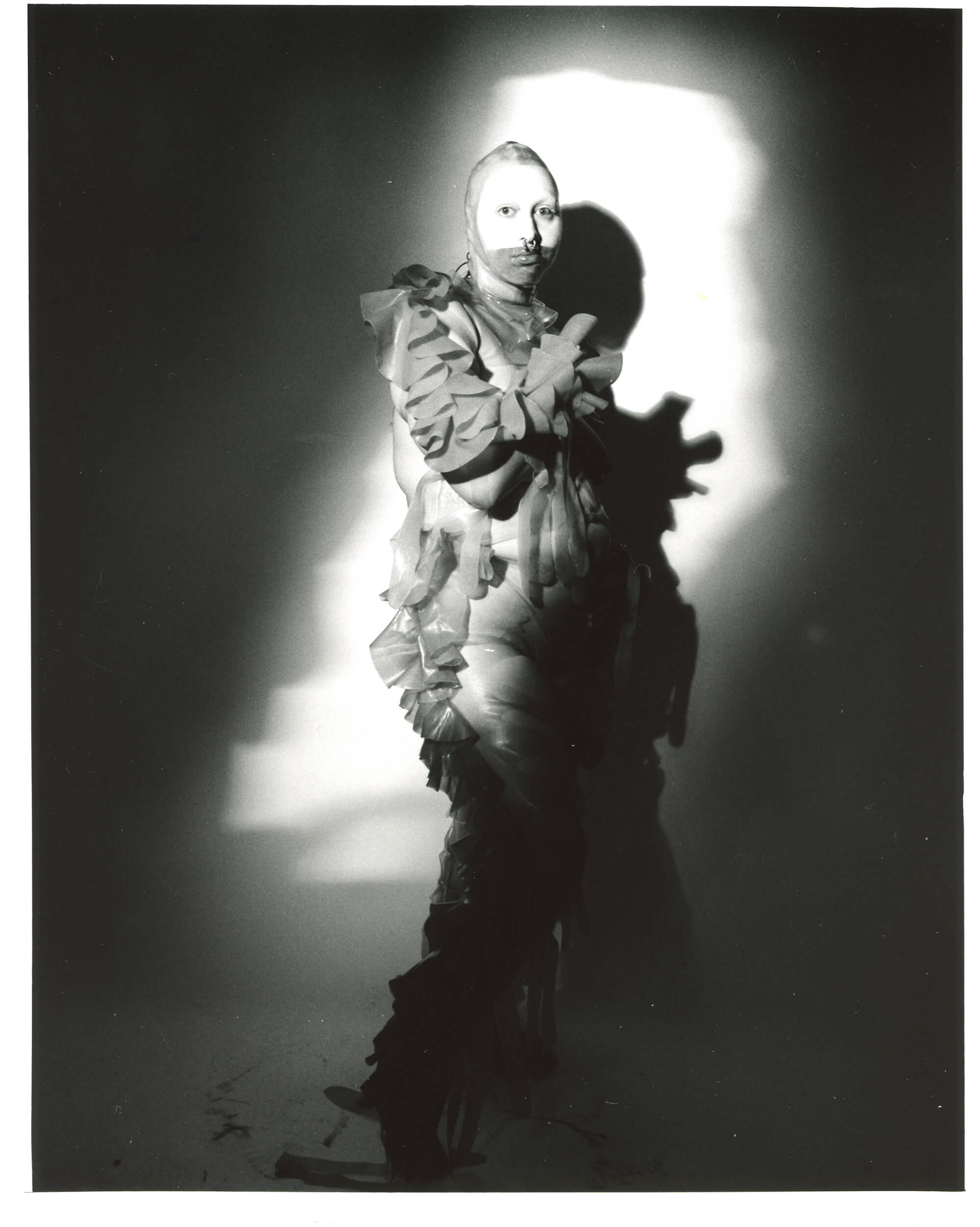 Jet hand knitted pieces, then liquid latex was applied to the garments. Studio Fclx focussed on layering the latex and creating a structured piece. Each layer of latex takes around 24 hours to solidify. Every mixed media piece is not only very unique, but a reflection of a long working process. The full collaboration is now available online.